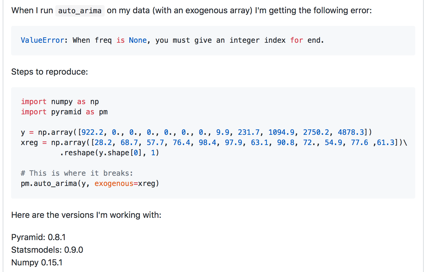 Please don’t be a lazy issue-filer! Submitting a screen shot of an Excel document, or poorly-formatted/incomplete code makes the maintainers’ lives difficult. Please include your data inline in a code-block so maintainers can easily try to replicate. What not to do: