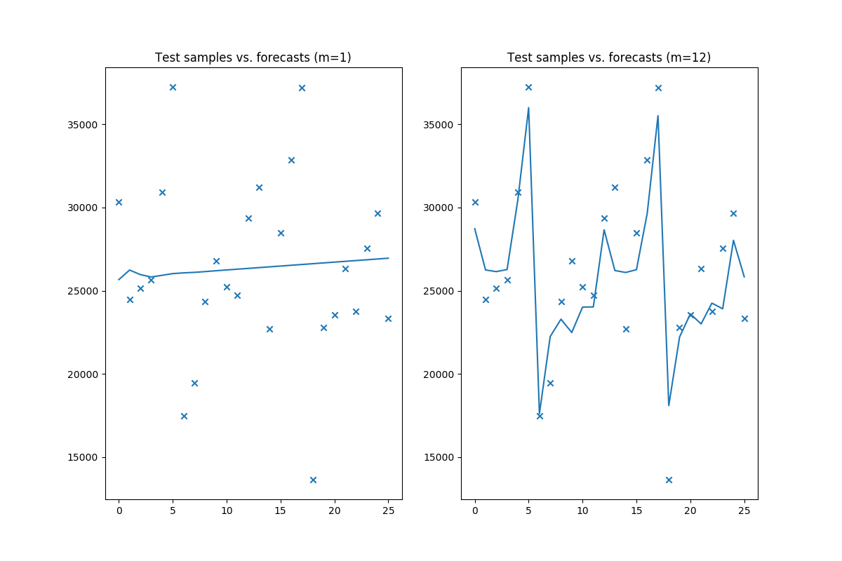 axes[1].set_title('Test samples vs. forecasts (m=12)')